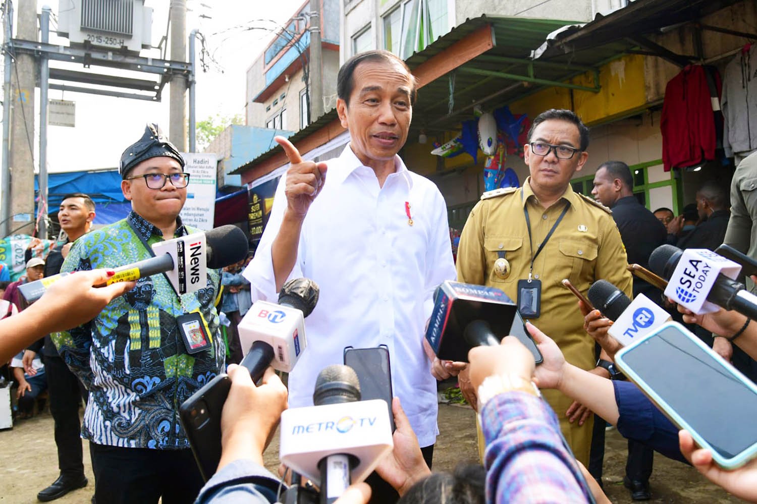 “Ya harga baik, harga baik. Tadi harga bawang merah turun sedikit, daging ayam juga harganya baik, baik itu untuk peternak dan untuk konsumen—masyarakat baik, saya kira stabilitas harga masih bisa (terkendali). Minyak tadi juga sama masih Rp14 ribu saya kira baik,” ucap Presiden saat memberikan keterangan kepada awak media di Pasar Parungpung. Foto: SHID/BPMI Setpres/Muchlis Jr