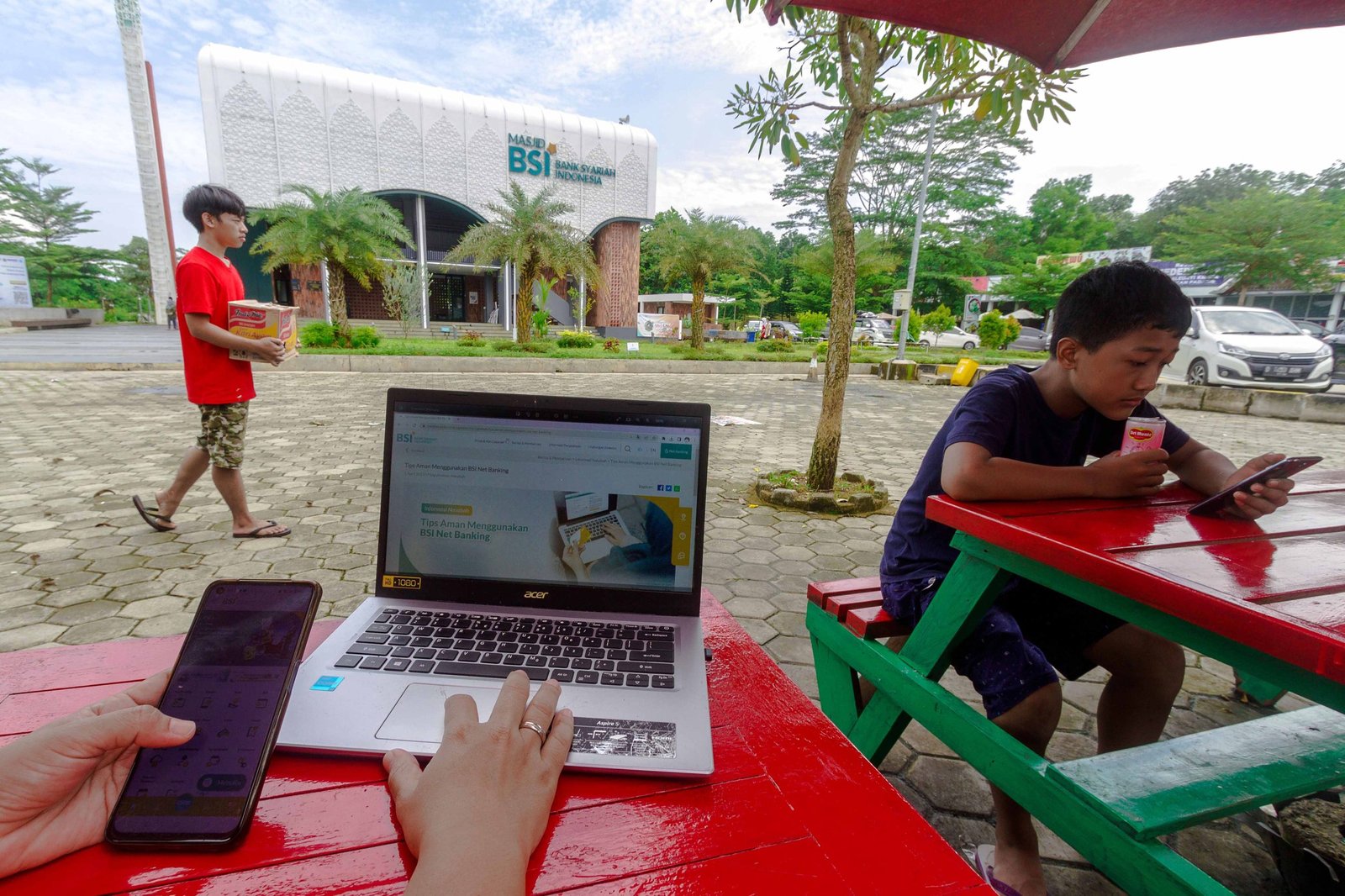 Pengunjung mebuka layananan BSI Net Banking di Rest Area Cipularang kilometer 88 A Ruas Tol Purwakarta-Bandung, Purbaleunyi, Jawa Barat, Senin (20/4/2023).