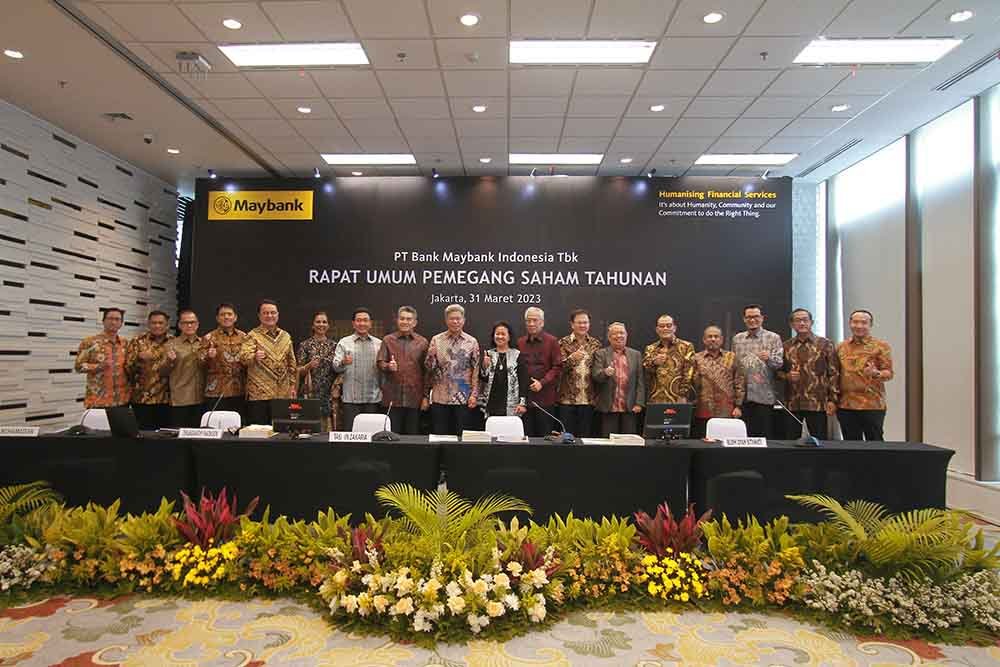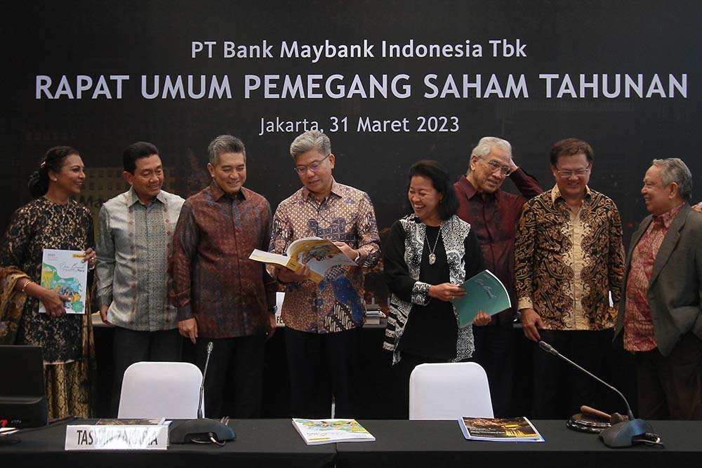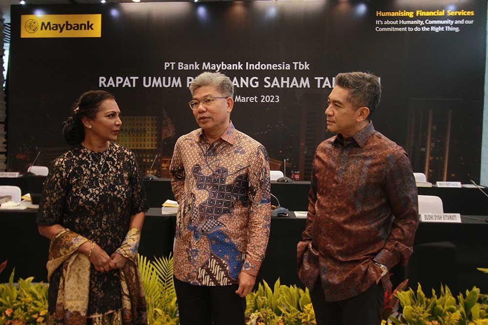 SinarHarapan.id – Direktur Keuangan Thilagavathy Nadason (kiri), Presiden Komisaris Dato’ Khairussaleh Ramli (tengah), Presiden Direktur Taswin Zakaria (kanan) seusai rapat Umum Pemegang Saham Tahunan (RUPST) di Kantor Pusat Maybank Indonesia, Senayan, Jakarta, Jumat (31/3/2023). RUPST Maybank Indonesia menyetujui Laporan Keuangan Konsolidasi yang telah diaudit untuk tahun buku yang berakhir pada 31 Desember 2022. Pengangkatan kembali Edwin Gerungan sebagai Komisaris, dan Hendar sebagai Komisaris Independen Maybank Indonesia dengan masa jabatan terhitung sejak ditutupnya RUPST sampai dengan penutupan RUPST Bank tahun 2026. Pengangkatan kembali Effendi, Steffano Ridwan dan Ricky Antariksa sebagai Direktur Maybank Indonesia dengan masa jabatan terhitung sejak ditutupnya RUPST sampai dengan penutupan RUPST Bank tahun 2026. SHID/Ruht Semiono