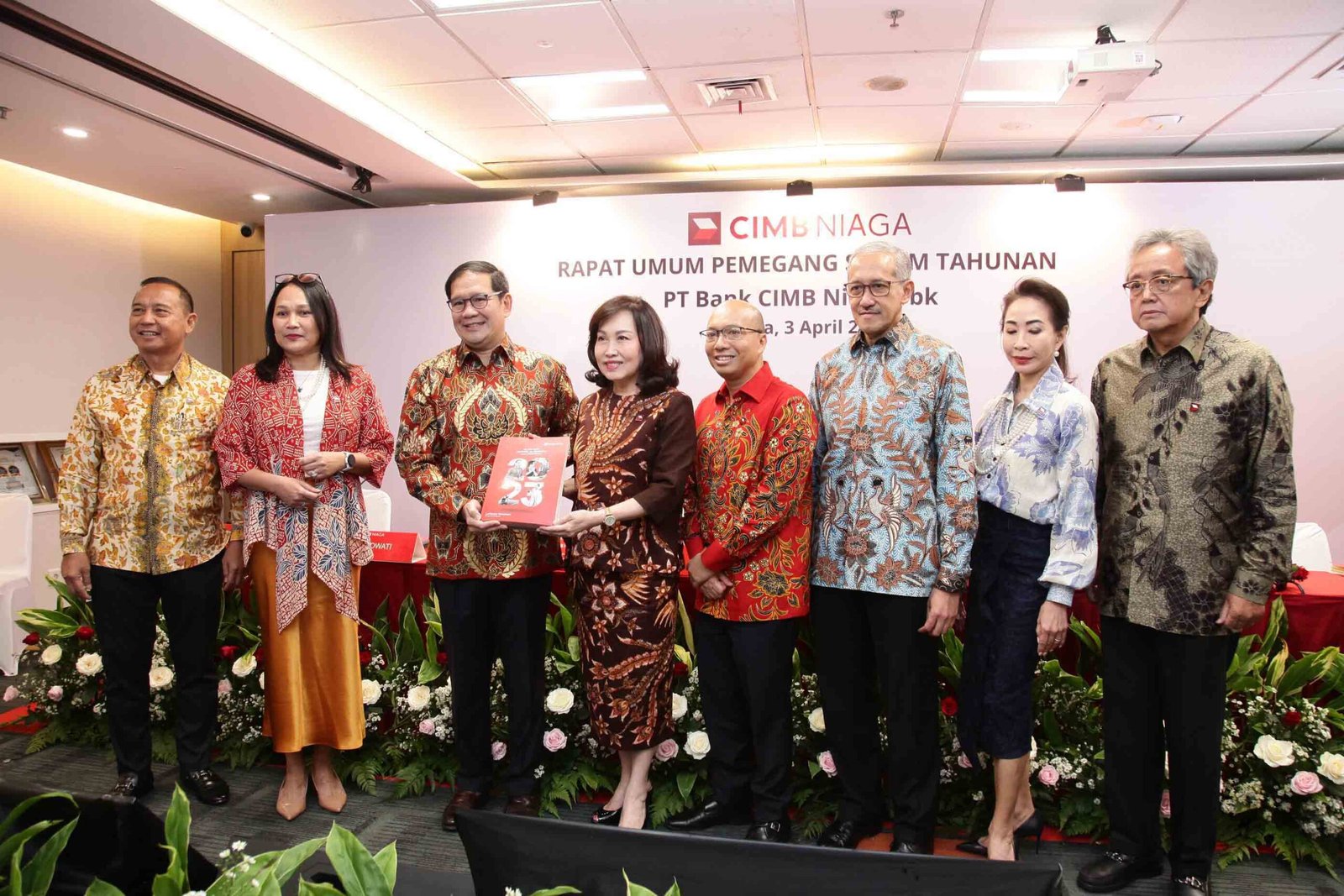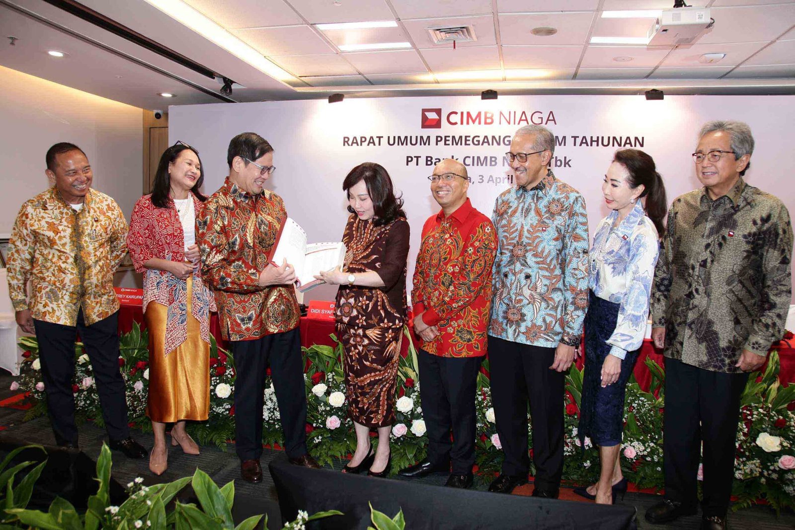 SinarHarapan.id – Presiden Komisaris CIMB Niaga Didi Syafruddin Yahya (ketiga kiri) bersama Presiden Direktur CIMB Niaga Lani Darmawan (keempat kiri), Wakil Presiden Komisaris Independen CIMB Niaga Glenn Muhammad Surya Yusuf (kanan), Komisaris CIMB Niaga Dato’ Abdul Rahman Ahmad (keempat kanan), Komisaris Independen CIMB Niaga Dody Budi Waluyo* (ketiga kanan), Komisaris Independen CIMB Niaga Sri Widowati (kedua kiri), Direktur Compliance, Corporate Affairs and Legal CIMB Niaga Fransiska Oei (kedua kanan), dan Komisaris Independen CIMB Niaga Periode 2016-2024 Jeffrey Kairupan (kiri) pada Rapat Umum Pemegang Saham Tahunan (RUPST) CIMB Niaga di Jakarta, Rabu (3/4/2024). Rapat menyetujui pembagian dividen tunai setinggi-tingginya 50% dari laba bersih CIMB Niaga (bank only) tahun buku 2023. Selain itu, para pemegang saham juga sepakat mengangkat Dody Budi Waluyo sebagai Komisaris Independen menggantikan Jeffrey Kairupan yang telah menyelesaikan masa baktinya. Foto: SHID/Ruht Semiono