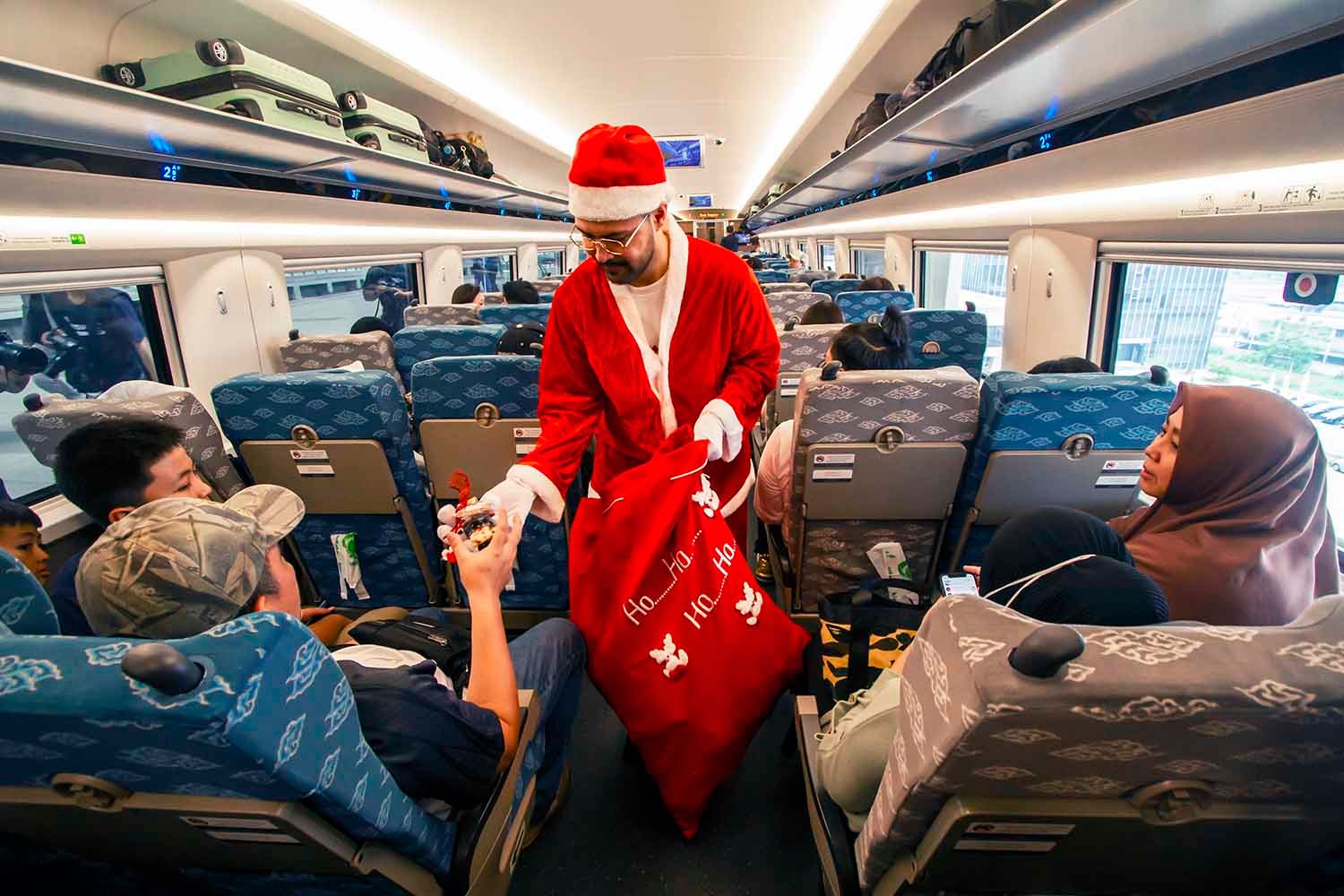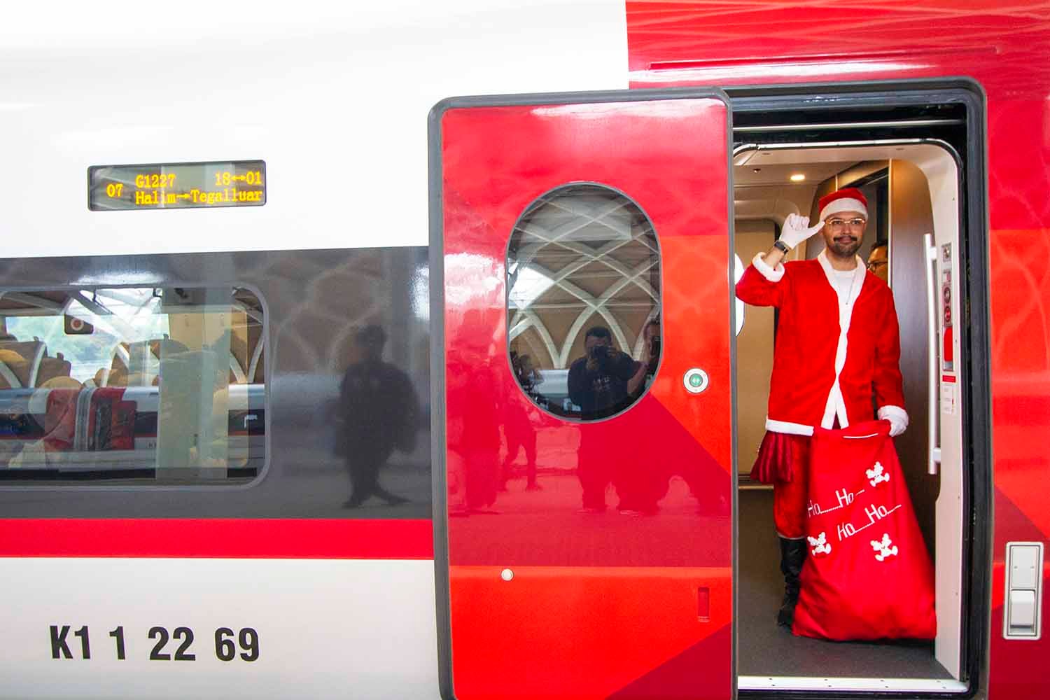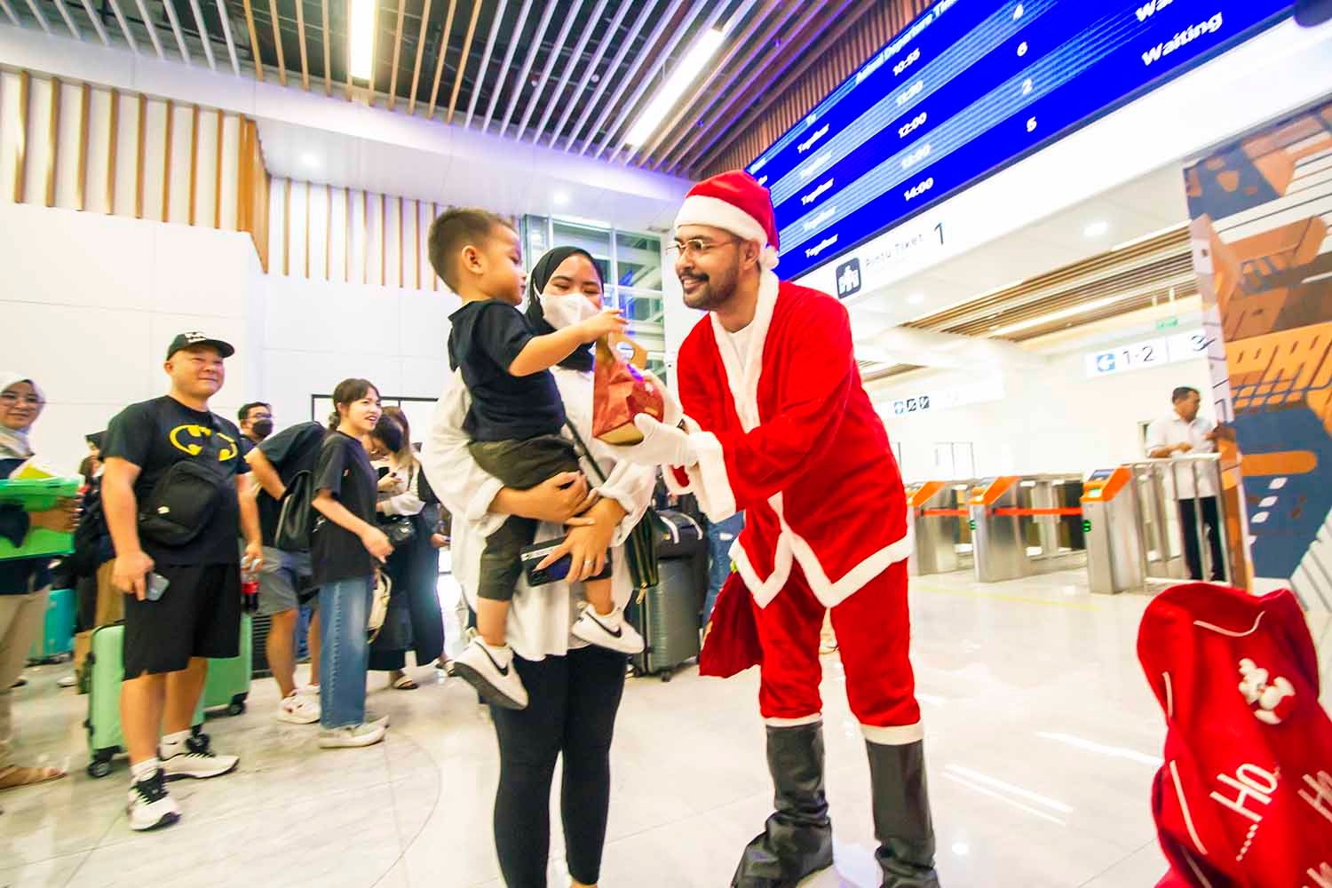 SinarHArapan.id – Santa Claus menghimbur dengan memberikan hadiah kepada penumpang anak Whoosh di Stasiun Kereta Cepat Halim, Jakarta Timur, Minggu (24/12/23). KCIC bertujuan memberikan kontribusi positif dan mewujudkan suasana penuh kegembiraan bagi penumpang Whoosh yang naik 20% pada momen libur Natal dan Tahun Baru. Foto: SHID/Ruht Semiono.