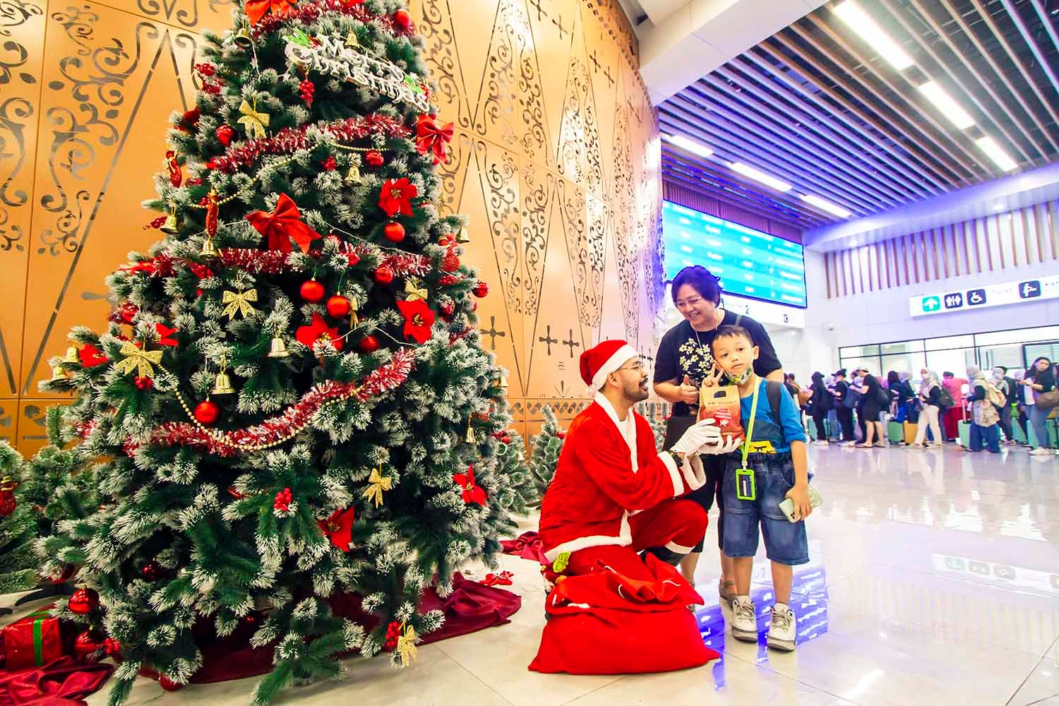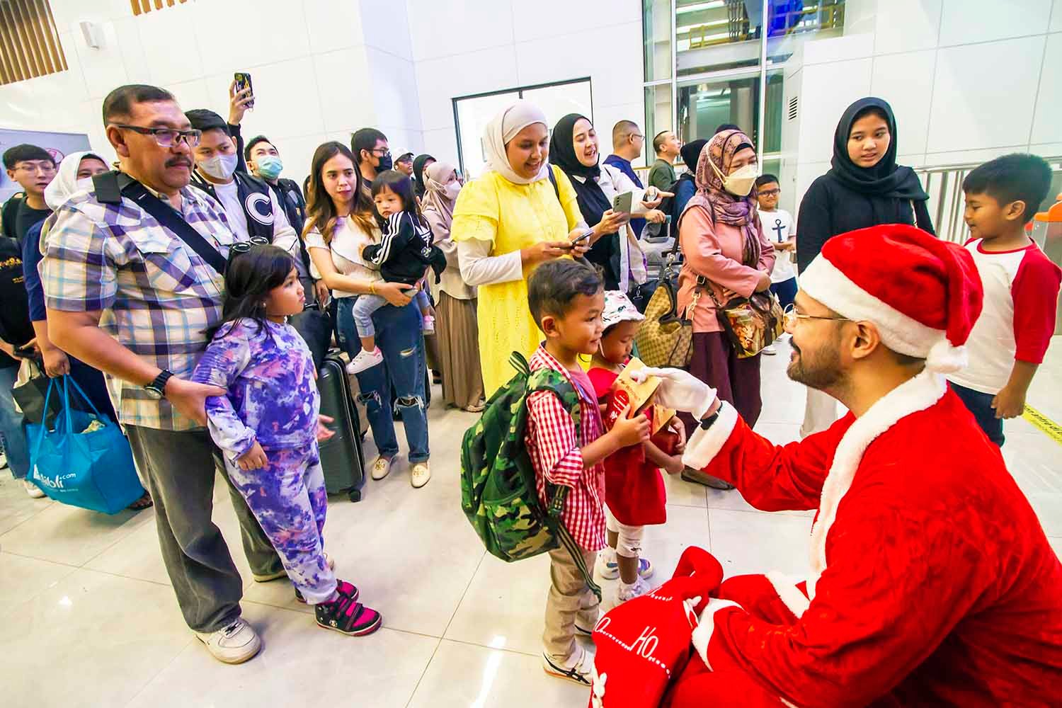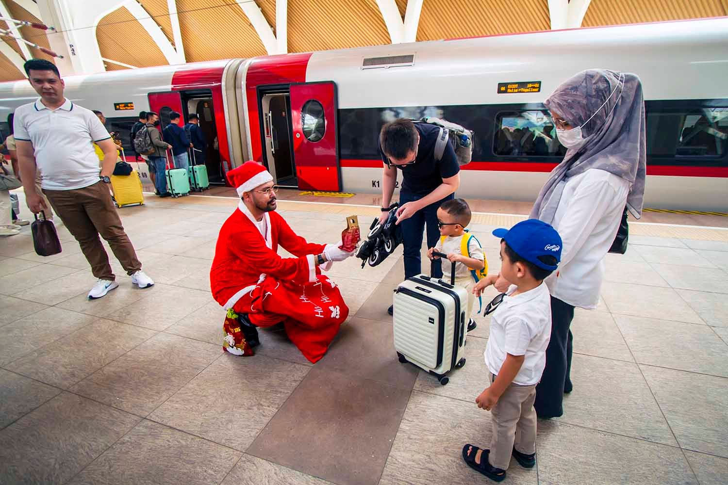 SinarHArapan.id – Santa Claus menghimbur dengan memberikan hadiah kepada penumpang anak Whoosh di Stasiun Kereta Cepat Halim, Jakarta Timur, Minggu (24/12/23). KCIC bertujuan memberikan kontribusi positif dan mewujudkan suasana penuh kegembiraan bagi penumpang Whoosh yang naik 20% pada momen libur Natal dan Tahun Baru. Foto: SHID/Ruht Semiono.