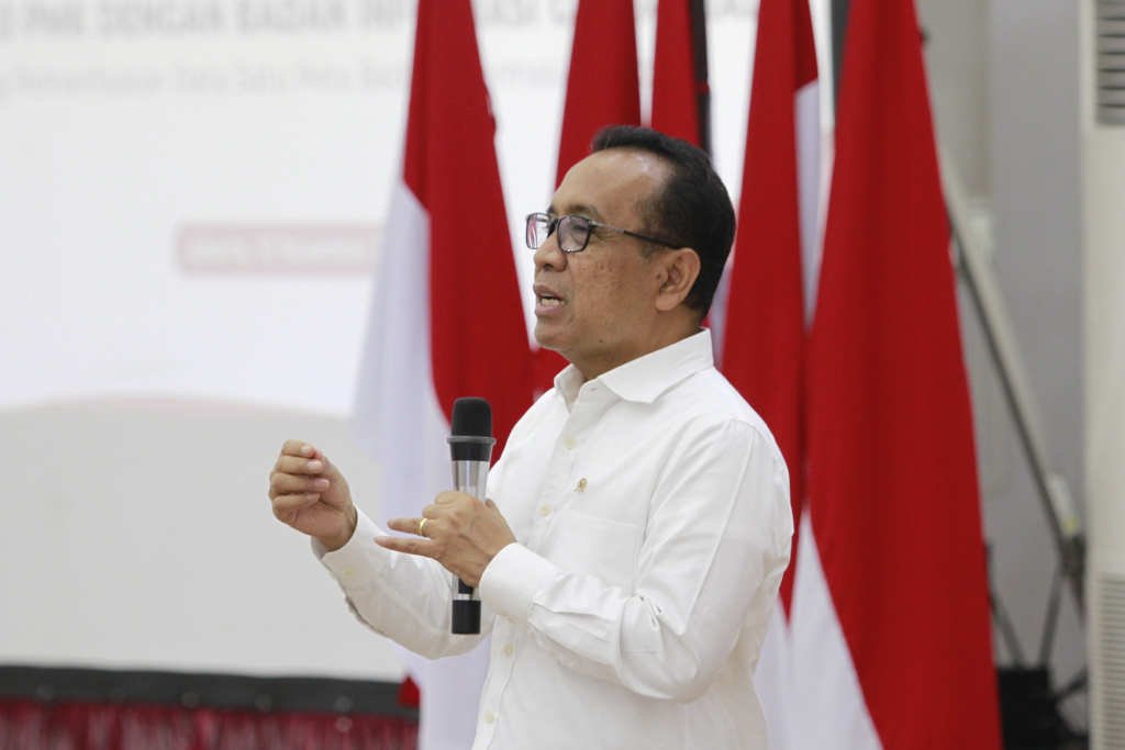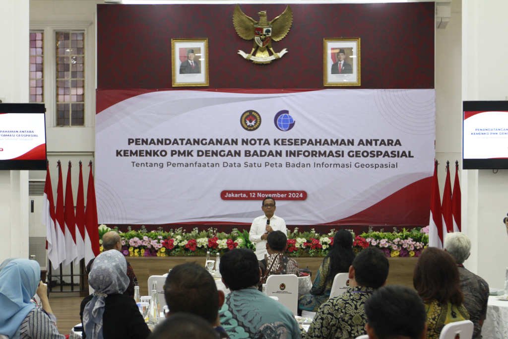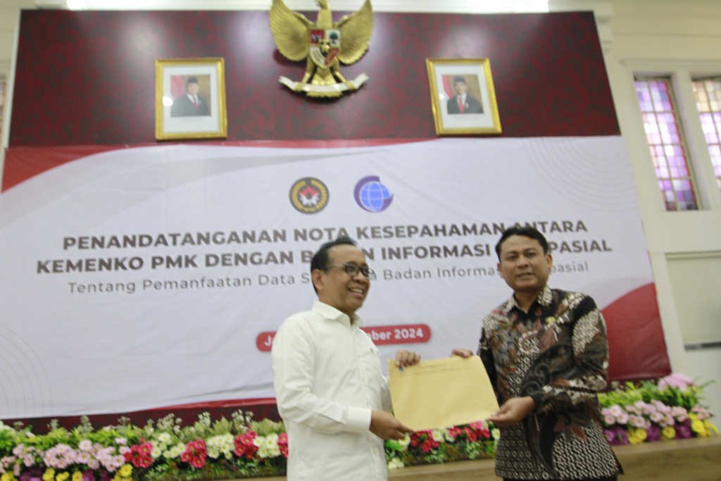 SinarHarapan.id – Menteri Koordinator Bidang Pembangunan Manusia dan Kebudayaan Pratikno, saat melakukan penandatanganan Nota Kesepahaman dengan Kepala Badan Informasi Geospasial Muh Aris Marfai di Jakarta, Selasa 12/11/2024). Penandatanganan ini menjadi langkah strategis bagi Kemenko PMK dalam memperkuat kerja sama lintas sektor, khususnya dalam pemanfaatan data satu peta badan informasi geospasial. Kerja sama ini diharapkan dapat mendorong penyusunan kebijakan berbasis data yang lebih tepat sasaran demi peningkatan kualitas pembangunan manusia dan kebudayaan di Indonesia. Foto: SHID/Ruht Semiono