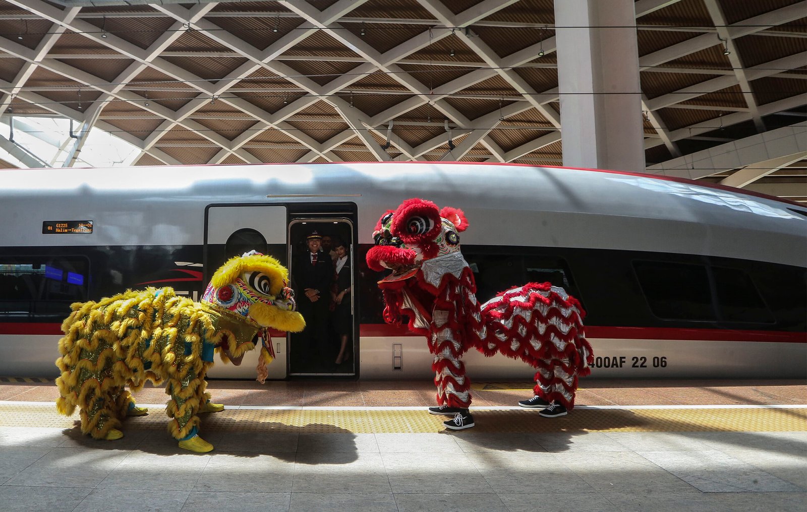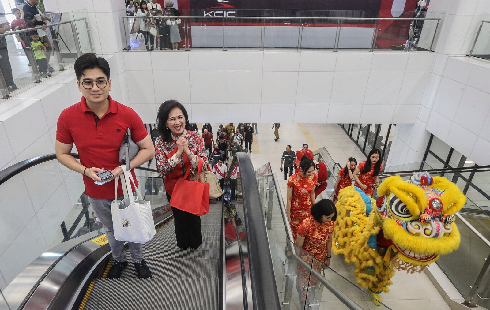 SinarHarapan.id – Penumpang menyaksikan atraksi barongsai di Stasiun Whossh Halim, Jakarta Timur, Sabtu (10/2/2024). Pertunjukan barongsai digelar untuk menghibur penumpang kereta cepat Whoosh dalam memeriahkan Tahun Baru Imlek 2575 Mu Long Nian (Tahun Naga Kayu). Foto: SHID/Ruht Semiono