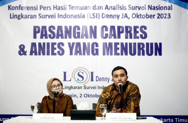 SinarHarapan.id – Peneliti senior LSI Denny JA, Adjie Alfaraby (kanan) didampingi moderator Fitri Hari memaparkan temuan dan analisis Survei Nasional bertajuk “Pasangan Capres & Anies Yang Menurun” di Jakarta, Senin (2/10/2023). Survei LSI menyatakan Prabowo unggul di Sumatera, Sulawesi, dan Maluku-Papua. Ganjar unggul di Jawa, Kalimantan dan Bali-NTB-NTT. Sementara di Pulau Jawa, Elektabilitas Ganjar unggul sebesar 42,2 %, disusul Prabowo Subianto di angka 36,8 % dan Anies sebesar 14,6 %. Foto /Elvis Sendouw