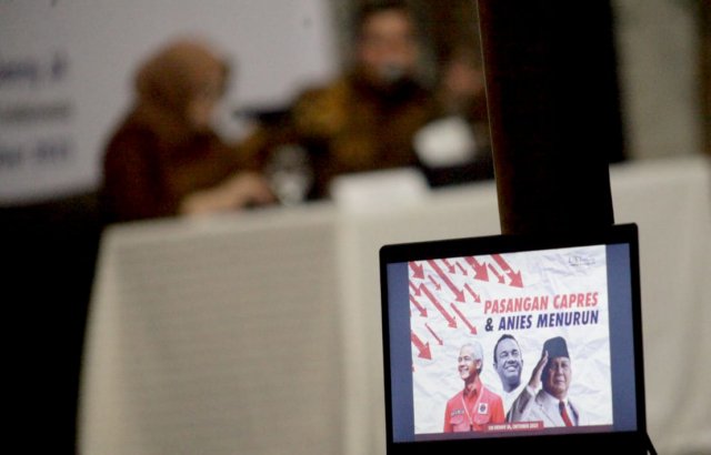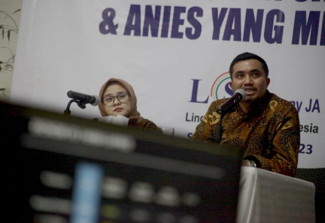 SinarHarapan.id – Peneliti senior LSI Denny JA, Adjie Alfaraby (kanan) didampingi moderator Fitri Hari memaparkan temuan dan analisis Survei Nasional bertajuk “Pasangan Capres & Anies Yang Menurun” di Jakarta, Senin (2/10/2023). Survei LSI menyatakan Prabowo unggul di Sumatera, Sulawesi, dan Maluku-Papua. Ganjar unggul di Jawa, Kalimantan dan Bali-NTB-NTT. Sementara di Pulau Jawa, Elektabilitas Ganjar unggul sebesar 42,2 %, disusul Prabowo Subianto di angka 36,8 % dan Anies sebesar 14,6 %. Foto /Elvis Sendouw