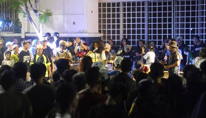 SinarHarapan.id – Massa aksi dari sejumlah seniman, konten creator dan masyarakat membawa poster dukungan produk UMKM konveksi pada Aksi Seni di Kota Tua, Jakarta, Minggu, Malam (16/11/2025). Kegiatan yang diselenggarakan pelaku UMKM Konveksi Sinergi Adv Nusantara bersama musisi Marjinal, Orkes Trotoar, Angklung Ramawijaya serta para para konten kreator Buntung Cees, Katababa, serta komunitas Citayam All Star yang diikuti Bonge, Jeje, Roy, Kurma, Alpin, Awwa, Della, Badru, Salsa, Jajat dan lainnya sebagai bentuk terima kasih kepada pemerintah karena sudah memberhentikan impor pakaian bekas ilegal. Foto: SHID/Ruht Semiono
