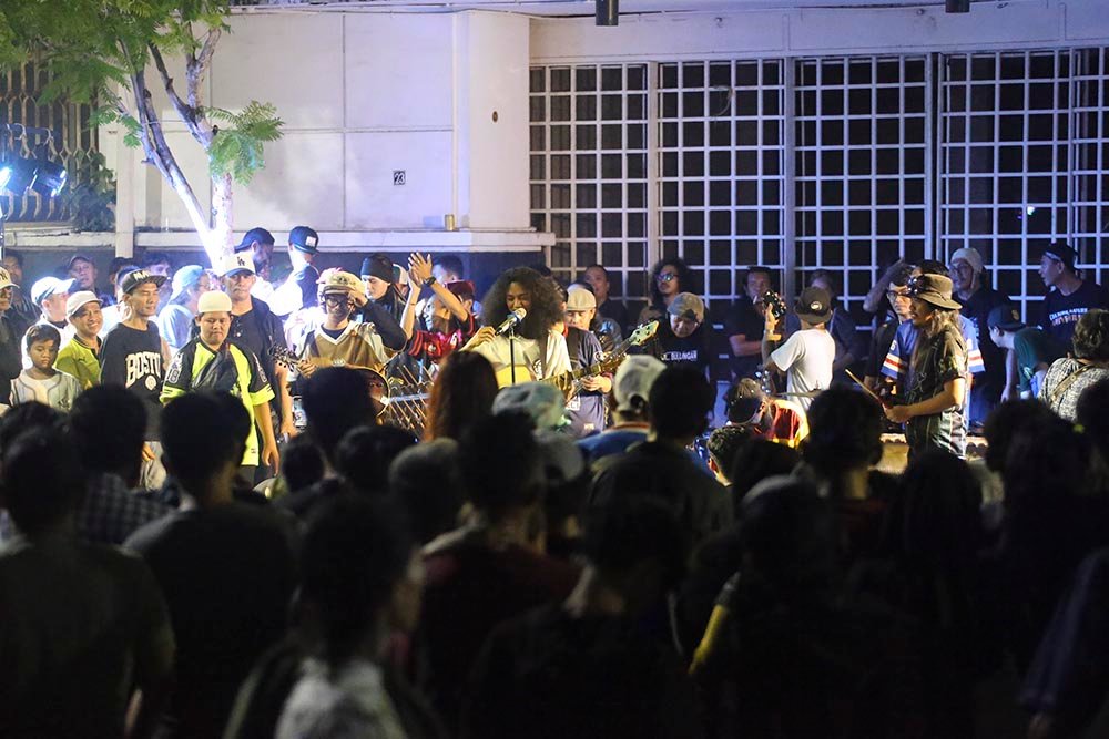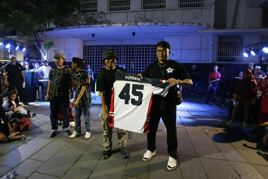 SinarHarapan.id – Massa aksi dari sejumlah seniman, konten creator dan masyarakat membawa poster dukungan produk UMKM konveksi pada Aksi Seni di Kota Tua, Jakarta, Minggu, Malam (16/11/2025). Kegiatan yang diselenggarakan pelaku UMKM Konveksi Sinergi Adv Nusantara bersama musisi Marjinal, Orkes Trotoar, Angklung Ramawijaya serta para para konten kreator Buntung Cees, Katababa, serta komunitas Citayam All Star yang diikuti Bonge, Jeje, Roy, Kurma, Alpin, Awwa, Della, Badru, Salsa, Jajat dan lainnya sebagai bentuk terima kasih kepada pemerintah karena sudah memberhentikan impor pakaian bekas ilegal. Foto: SHID/Ruht Semiono