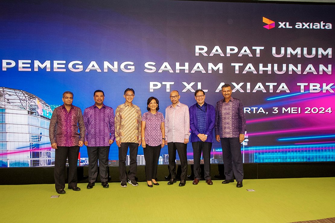 SinarHarapan.id – (kiri ke kanan) Direktur and Chief Financial Officer PT XL Axiata Tbk. Feiruz Ikhwan bersama dengan Direktur and Chief Technology Officer I Gede Darmayusa, Presiden Komisaris Muhamad Chatib Basri, Presiden Direktur and CEO Dian Siswarini, Direktur and Chief IT Digital Rico Usthavia Frans, Direktur and Chief Commercial Officer Commerce David Arcelus Oses dan Direktur and Chief Commercial Officer Home Convergence Abhijit J. Navalekar berbincang disela-sela Rapat Umum Pemegang Saham Tahunan (RUPST) di Jakarta, Jumat (3/5/2024). RUPST tersebut menyetujui pembagian dividen untuk pemegang saham sebesar Rp635,5 miliar atau 50 persen dari keuntungan setelah penyesuaian.  Foto: SHID/Ruht Semiono.