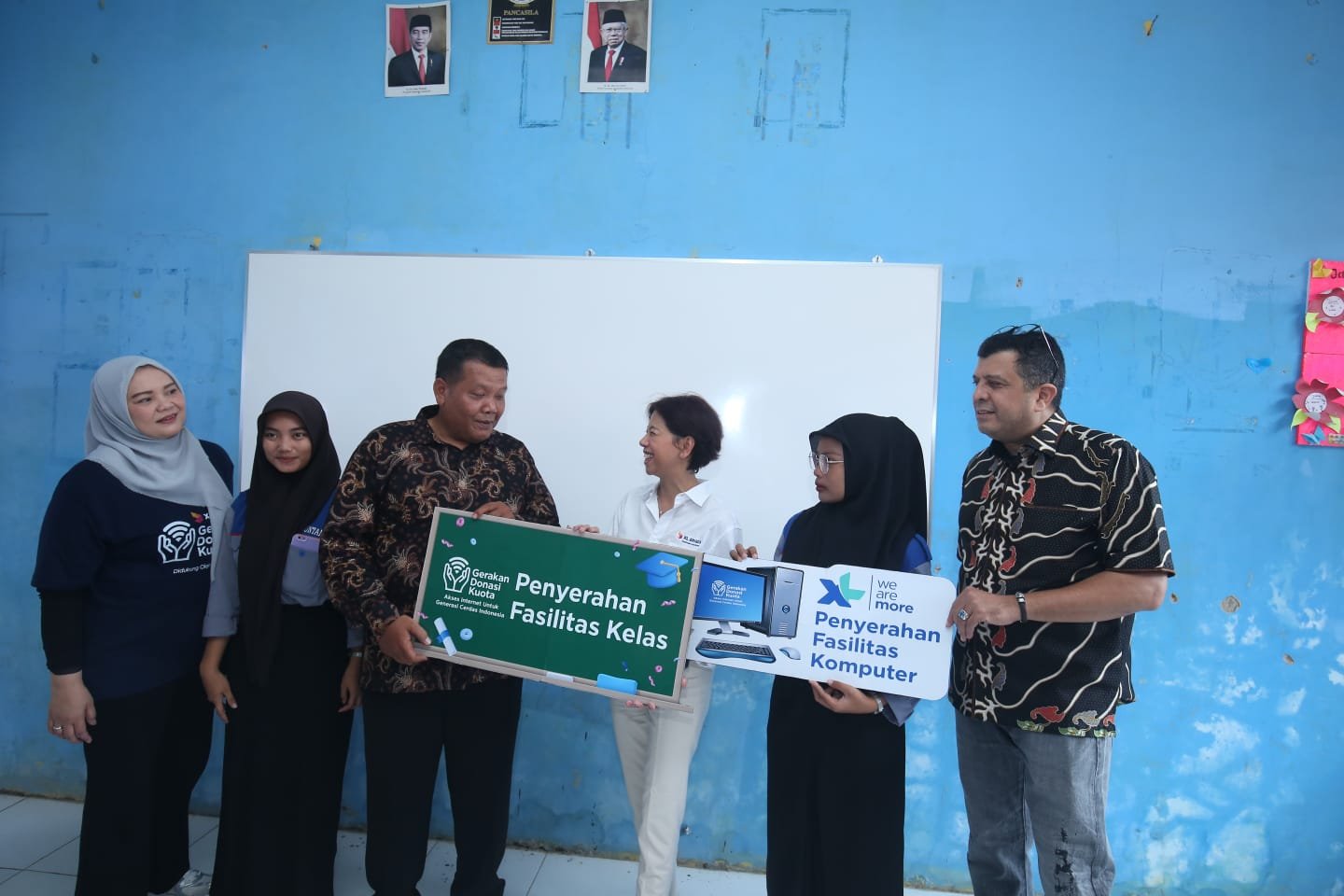 SinarHarapan.id – Direktur and Chief Enterprise Business and Corporate Affairs Officer PT XL Axiata Tbk. (EXCL) Yessie D. Yosetya (ketiga kanan) didampingi Chief Corporate Affairs Marwan O. Baasir (kanan) dan Group Head Region Jabodetabek Rd. Sofia Purbayanti (kiri) menyerahkan fasilitas kelas secara simbolis kepada kepala sekolah SMK Adhi Karya di Bekasi, Jawa Barat, Rabu (2/10/2024).PT XL Axiata Tbk. (EXCL) menyalurkan manfaat Program Gerakan Donasi Kuota (GDK) dengan total lebih dari 30 juta MB kepada 28 lembaga pendidikan di Indonesia. Hingga akhir tahun, XL Axiata menargetkan sebanyak 200 lembaga pendidikan termasuk sekolah, pesantren, panti asuhan, dan panti disabilitas untuk dapat menikmati manfaat dari Program GDK. Foto: SHID/HO