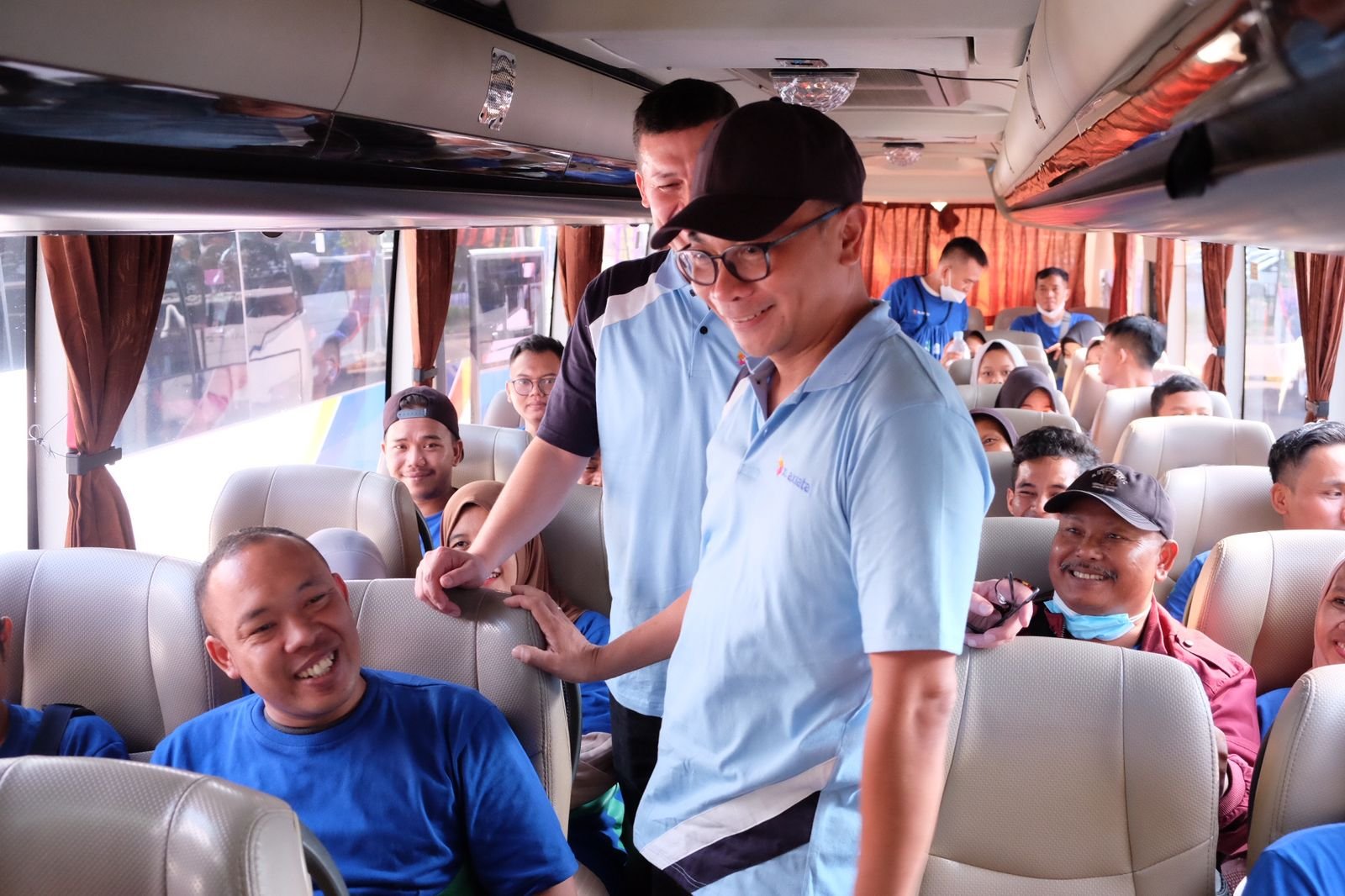 SinarHarapan.id – Direktur & Chief Teknologi Officer XL Axiata, I Gede Darmayusa berbincang dengan salah satu pemudik Alphard di acara pelepasan armada Mudik Bareng XL Axiata di Jakarta, Rabu (19/4/2023). XL Axiata kembali menggelar program Mudik Bareng bagi mitra penjualan produk layanan XL Axiata dari wilayah Jabodetabek. Sedikitnya 600 peserta mengikuti program ini, dengan tujuan ke sejumlah kota di Jawa Tengah, DI Yogyakarta, Jawa Timur. XL Axiata telah menyiapkan 13 unit bus besar, 5 unit innova dan 5 unit Alphard. Foto: Istimewa