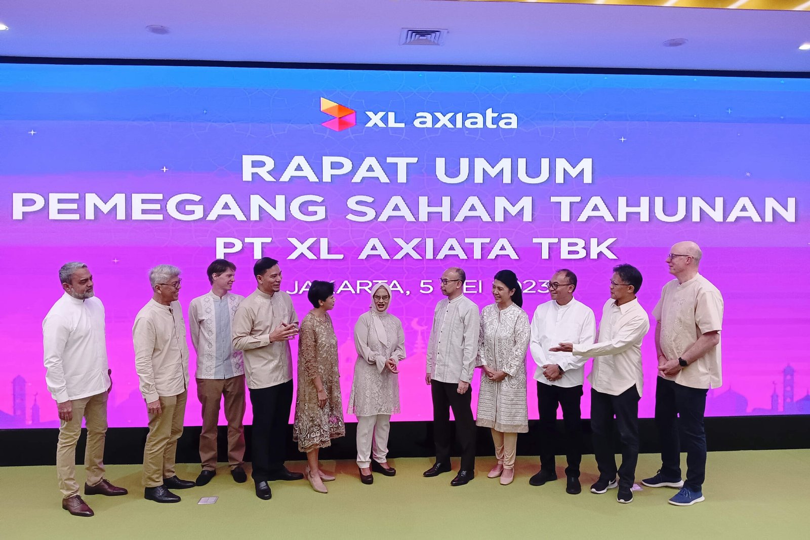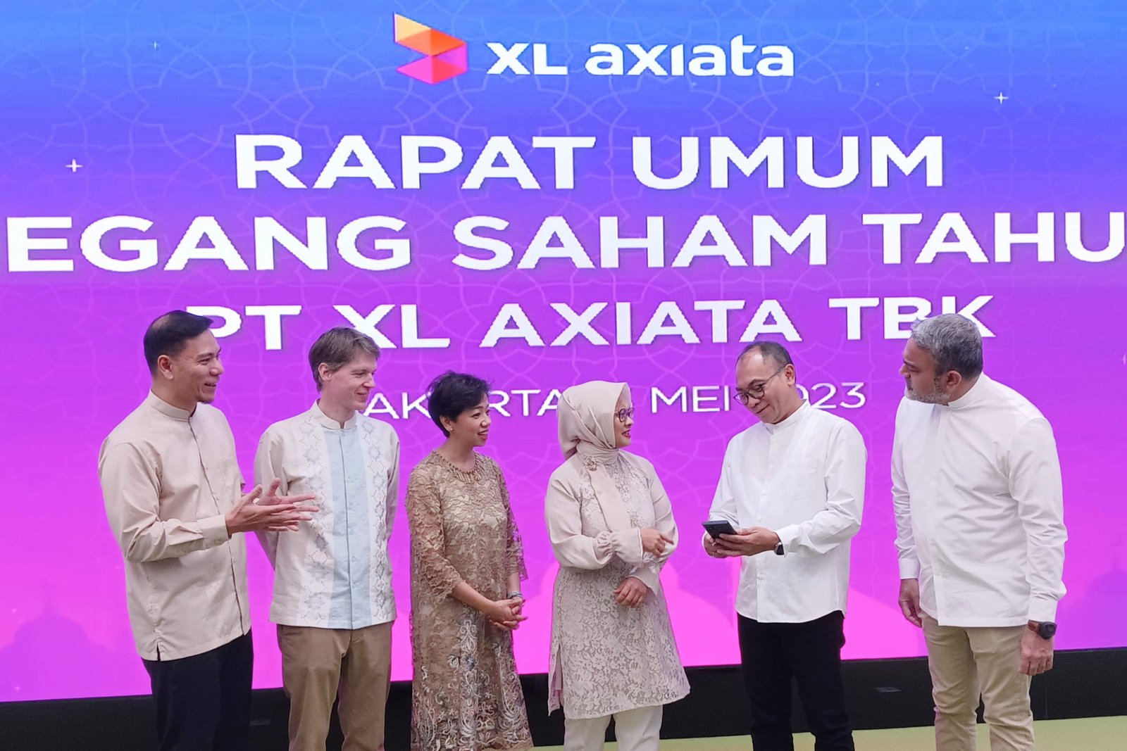 SinarHarapan.id – (kiri-kanan) Direktur & Chief Commercial Officer – Home & Convergence XL Axiata, Abhijit J. Navalekar, Presiden Direktur & CEO XL Axiata, Dian Siswarini, Direktur & Chief Digital Transformation & Enterprise Business Officer XL Axiata, Yessie D. Yosetya, Direktur & Chief Commercial Officer – Consumer XL Axiata, David Arcelus Oses, Direktur & Chief Technology Officer XL Axiata, I Gede Darmayusa, dan Direktur & Chief Finance Officer XL Axiata, Feiruz Ikhwan foto bersama di sela-sela acara RUPS Tahunan 2023 XL Axiata di Jakarta pada Jumat (5/5/2023). Rapat yang berlangsung secara daring tersebut memiliki enam mata acara yang telah disetujui. Termasuk di antaranya persetujuan atas perubahan susunan Direksi dan pembagian dividen untuk pemegang saham sebesar Rp 551,7 miliar atau 50 persen dari keuntungan setelah penyesuaian.