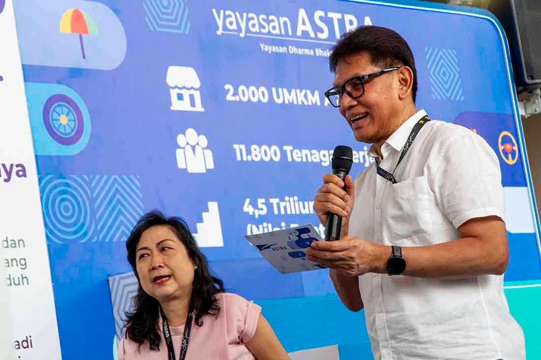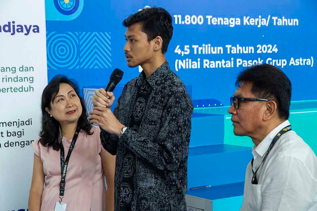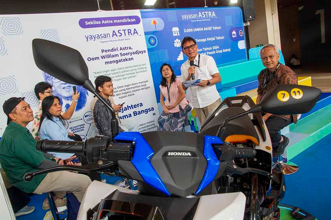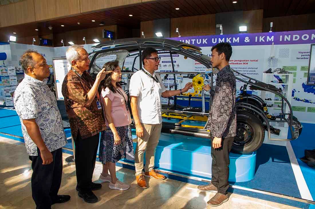SinarHarapan.id – Ketua Pengurus Yayasan Astra – Yayasan Dharma Bhakti Astra Rahmat Samulo didampingi Advisor Yayasan Astra – Yayasan Dharma Bhakti Astra Tonny Sumartono dan Sekretaris Pengurus Yayasan Astra – Yayasan Dharma Bhakti Astra Ema Poedjiwati Prasetio berbincang dengan pemilik Industri Kecil Menengah (IKM) PT Besq Sarana Abadi binaan Yayasan Astra – Yayasan Dharma Bhakti Astra Imron Hanafi dan Second Generation PT Noerhayat Berkah Sejahtera Muhammad Orlando saat melihat produk UMKM di Pameran Gaikindo Indonesia International Auto Show (GIIAS) 2025, di ICE BSD, Tangerang, Banten, Jumat (25/7/2025).