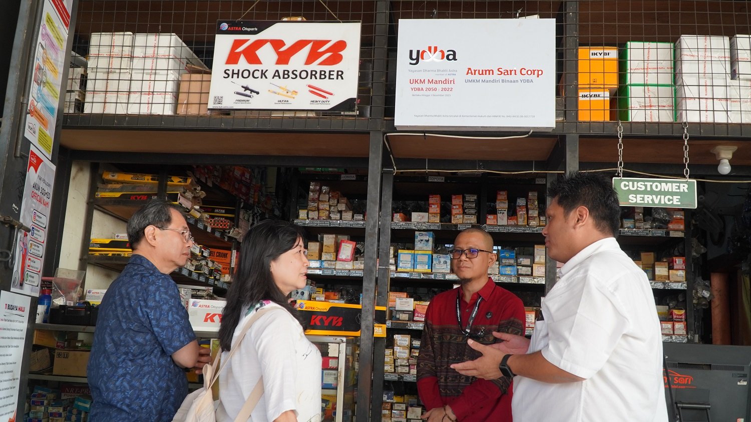SinarHarapan.id – Ketua Pengurus Yayasan Dharma Bhakti Astra (YDBA), Sigit P. Kumala (kiri); Sekretaris Pengurus YDBA, Ema Poedjiwati Prasetio (kedua kiri) dan Region Operation Head PT Astra Otoparts Tbk, Joni Indra Rukmana (kanan) saat mengunjungi UMKM bengkel binaan Astra melalui YDBA, Bengkel Arum Sari di Banyumas. Kunjungan disambut langsung oleh Pemilik Bengkel, Fuad Sirojuddin Yahya (kedua kanan). Bengkel Arum Sari merupakan salah satu UMKM Bengkel yang ikut serta dalam kolaborasi Penyediaan Sparepart Bengkel antara YDBA dan PT Astra Otoparts Tbk. Dalam kolaborasi tersebut, Arum Sari menjadi bengkel dengan nilai transaksi tertinggi keempat dari 39 UMKM yang terlibat dalam kolaborasi tersebut. Foto: SHID/Istimewa