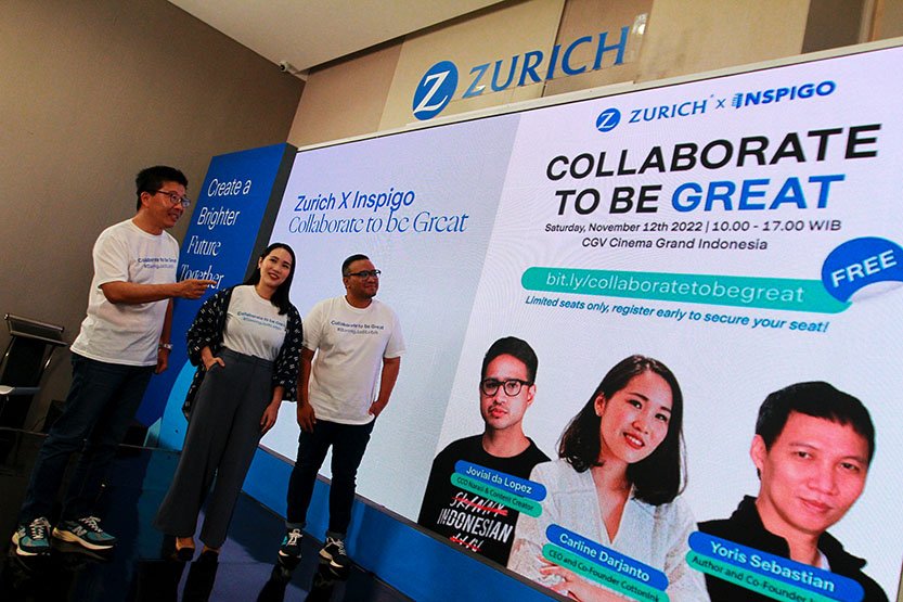 SinarHarapan.id – Sejumlah narasumber (dari kiri ke kanan) CEO Zurich Asuransi Indonesia Edhi Tjahja Negara, Founder & CEO Inspigo Tyo Guritno, dan Co-Founder & CEO COTTONINK Carline Darjanto pada Konferensi Pers Peluncuran Kolaborasi Zurich x Inspigo di Jakarta (03/11/2022). Kolaborasi ini bertujuan menginspirasi generasi muda agar berkolaborasi untuk wujudkan potensi terbaiknya. Lewat pendekatan berbeda, Zurich juga ingin membawa konsep asuransi yang dekat, ramah, dan relevan dengan generasi muda. Kolaborasi ini akan menghadirkan serangkaian kelas inspiratif bertema Collaborate to be Great bagi profesional muda yang akan diselenggarakan secara offline pada 12 November 2022 di CGV Grand Indonesia. Foto:SH/Ruht Semiono